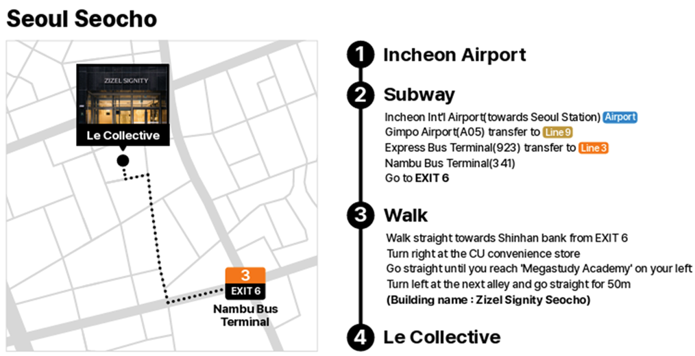*From exit 6(Line 3 Nambu Bus Terminal Station), 5minutes, From Exit 14 (Line 2 and 3 Seoul National University of Education Station), 9minutes by walk
