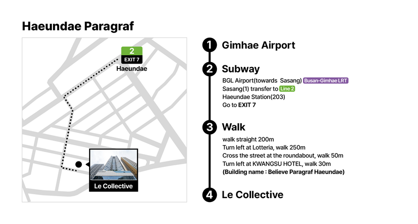 Take Subway Line 1 at Busan Station → Transfer to Line 2 at Seomyeon Station → Get off at Haeundae Station (Exit 7) → 8-minute walk