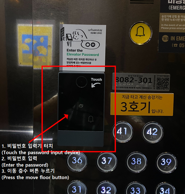 Please check the elevator password sent in your check-in message (KakaoTalk alert).