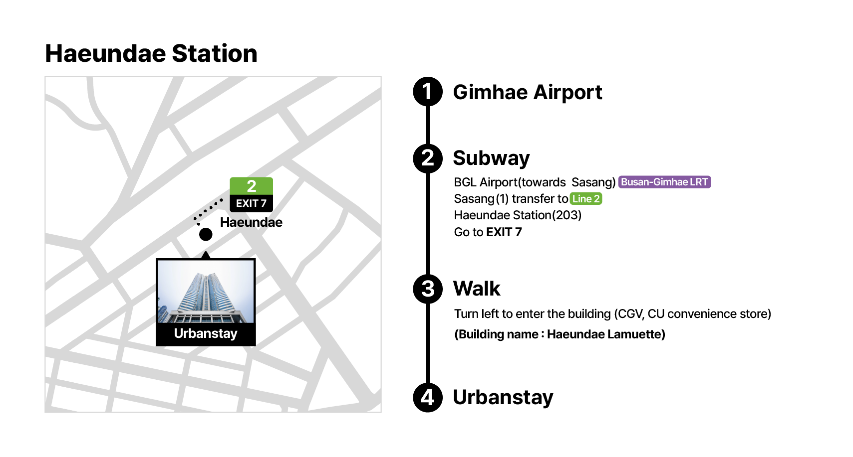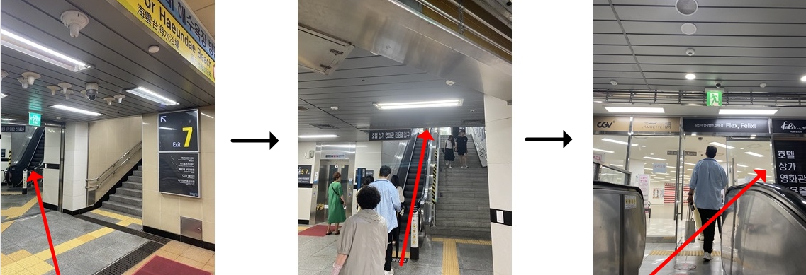 If you exit from Haeundae Station Exit 7, you'll find an escalator next to the building. Turn right and walk straight to reach the elevator leading to the guest rooms.