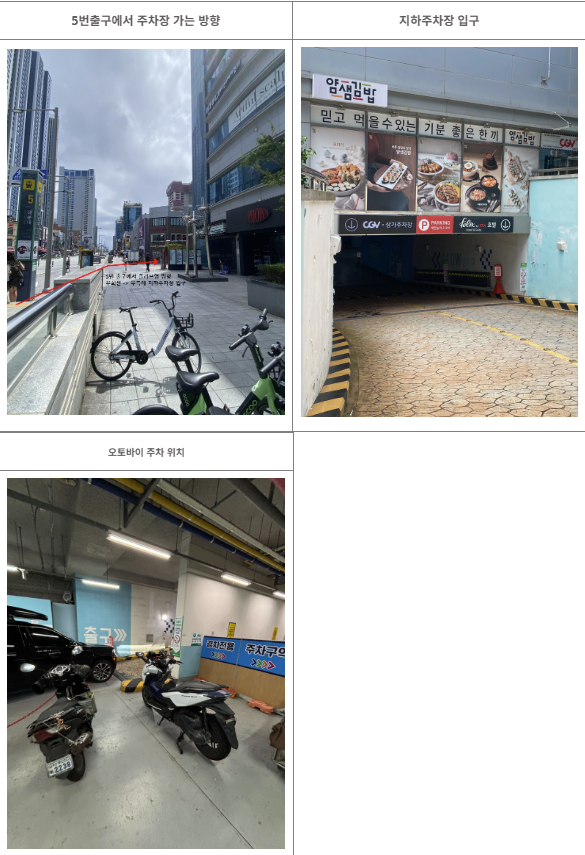 From Exit 5 of Haeundae Station, turn right into the Olive Young alley, and the underground parking entrance is 10 meters ahead on the right.