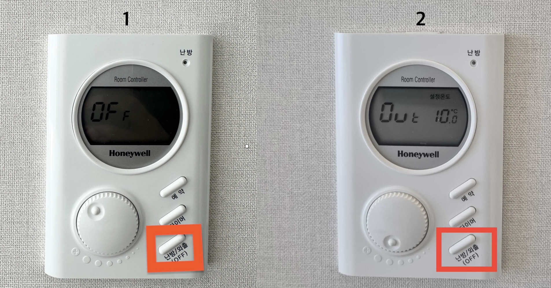 The screen with 'Out' is the state of out, Press the power button(Red box) button one more time lightly to turn on the heating.