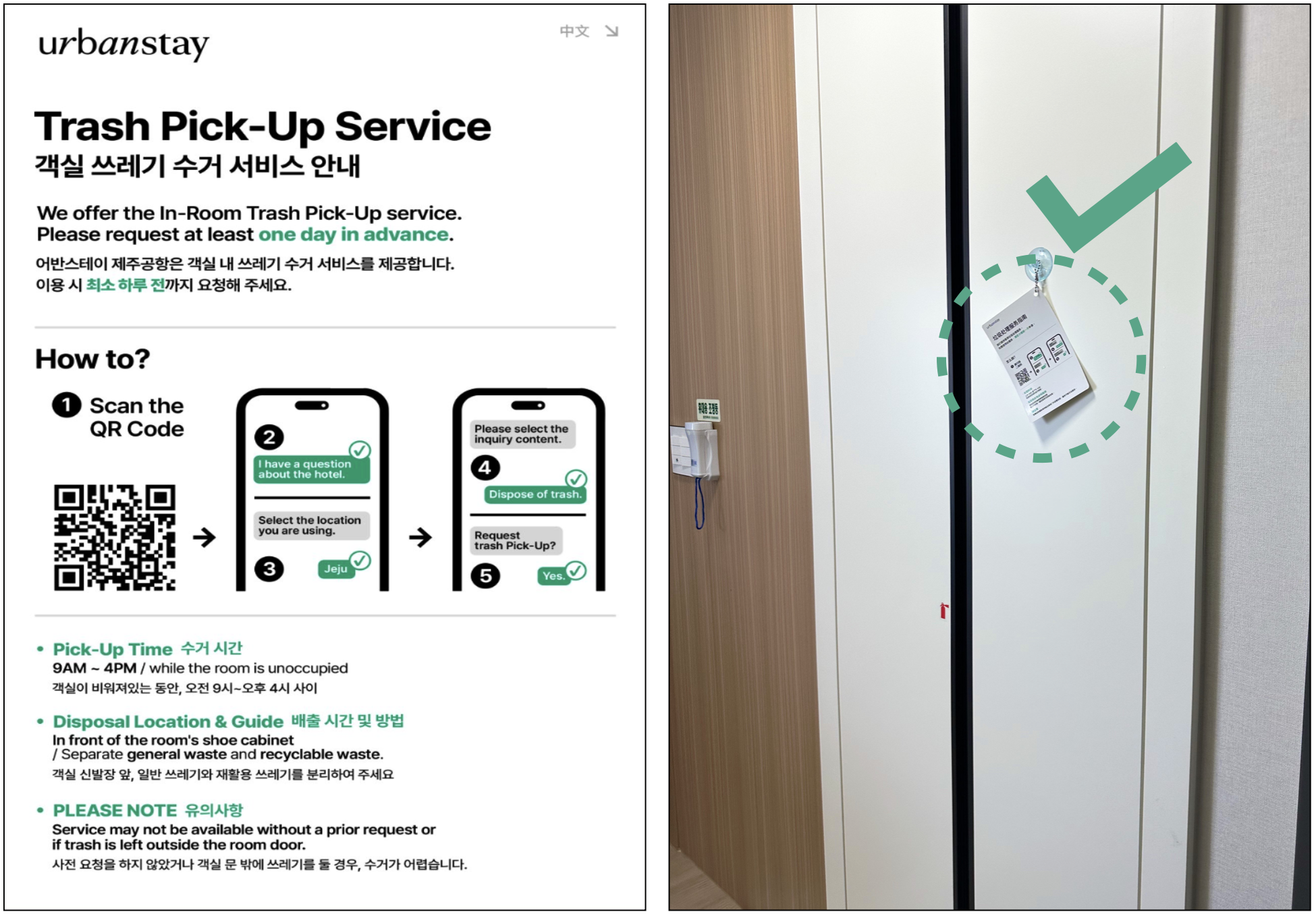 ※ This service is for Trash Pick-up only and does not include outside trash that has not been requested in advance or left in the hallway※ This service is not mandatory and can be requested after check-out or when requesting room cleaning (for a fee)※ You can also apply for the service through the ‘Trash Pick-up Service’ attached to the shoe rack in your room