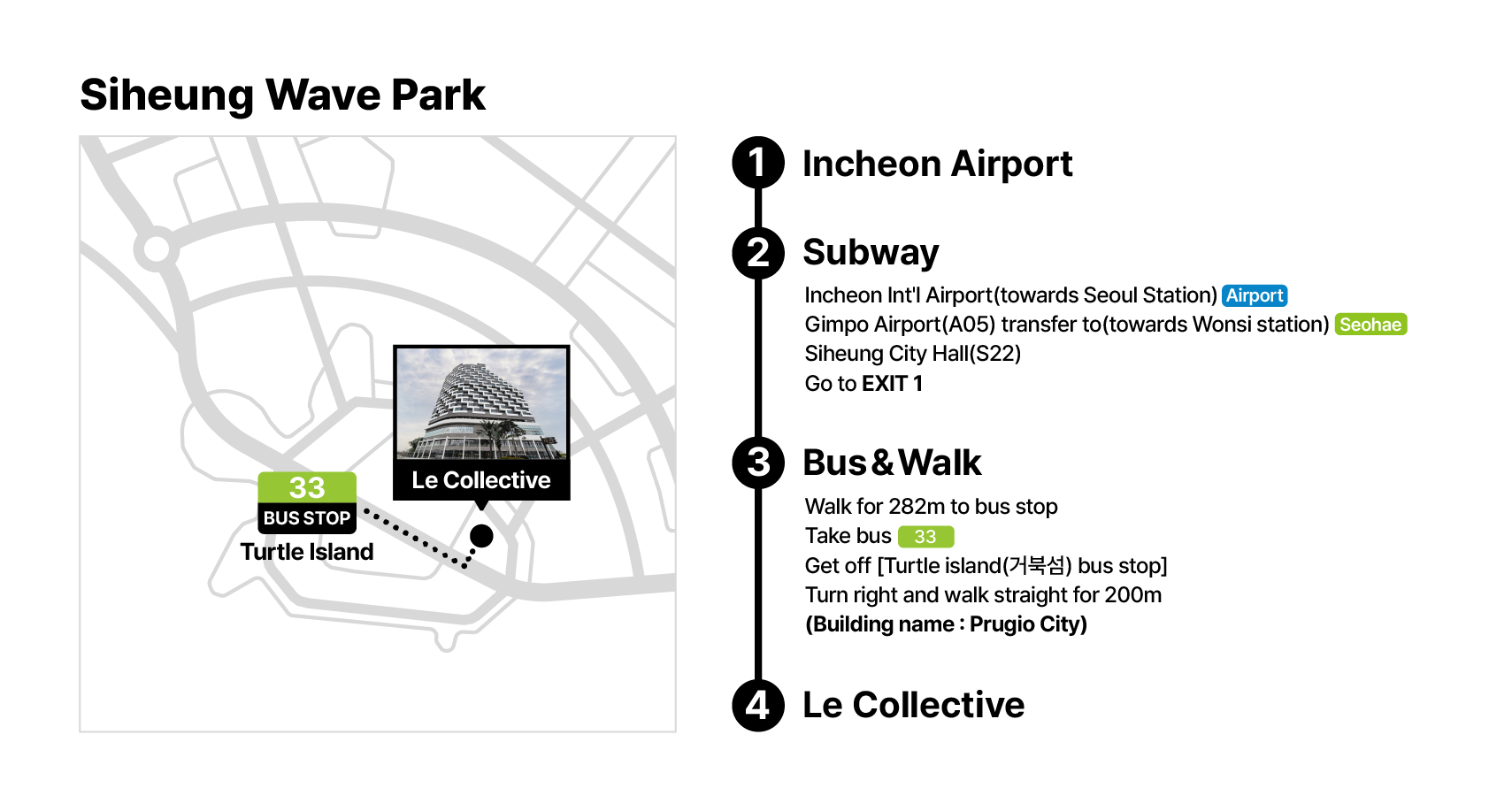 仁川国際空港駅(ソウル駅方面) → 金浦空港駅で 西海(ソヘ)線に乗り換え(元室[ウォンシ]方面)→ 始興市庁駅 1番出口へ→ バス停から 33番バスに乗車 → 亀島(거북섬) バス停で下車→ 右折して 200 m 直進