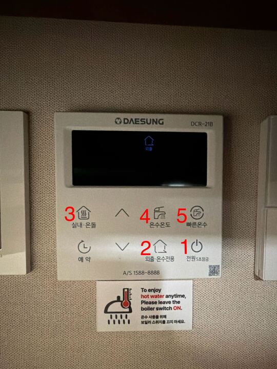 ボイラーパッドで「외출(外出)」、「목욕(入浴)」モードのうち、1つを設定すると 温水使用が可能です。