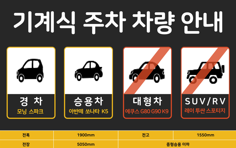 長さ5.1m、幅1.9m、高さ1.5m、重量2トン以下の車両のみ駐車可能