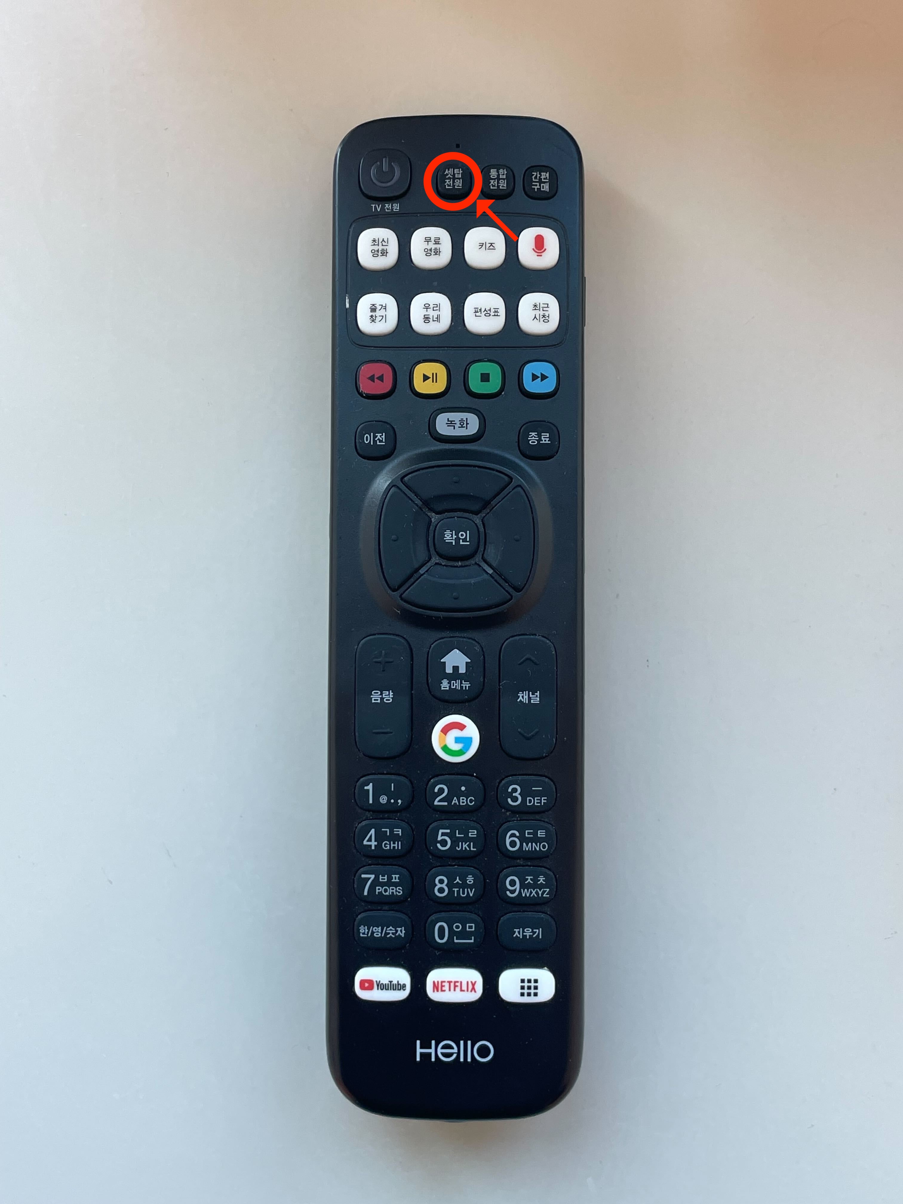 リモコンの上部にある「셋톱 전원(セットトップ電源)」ボタン、または右側面にある「외부입력(外部入力)」ボタンを押して、HDMI 2/3に設定してください。