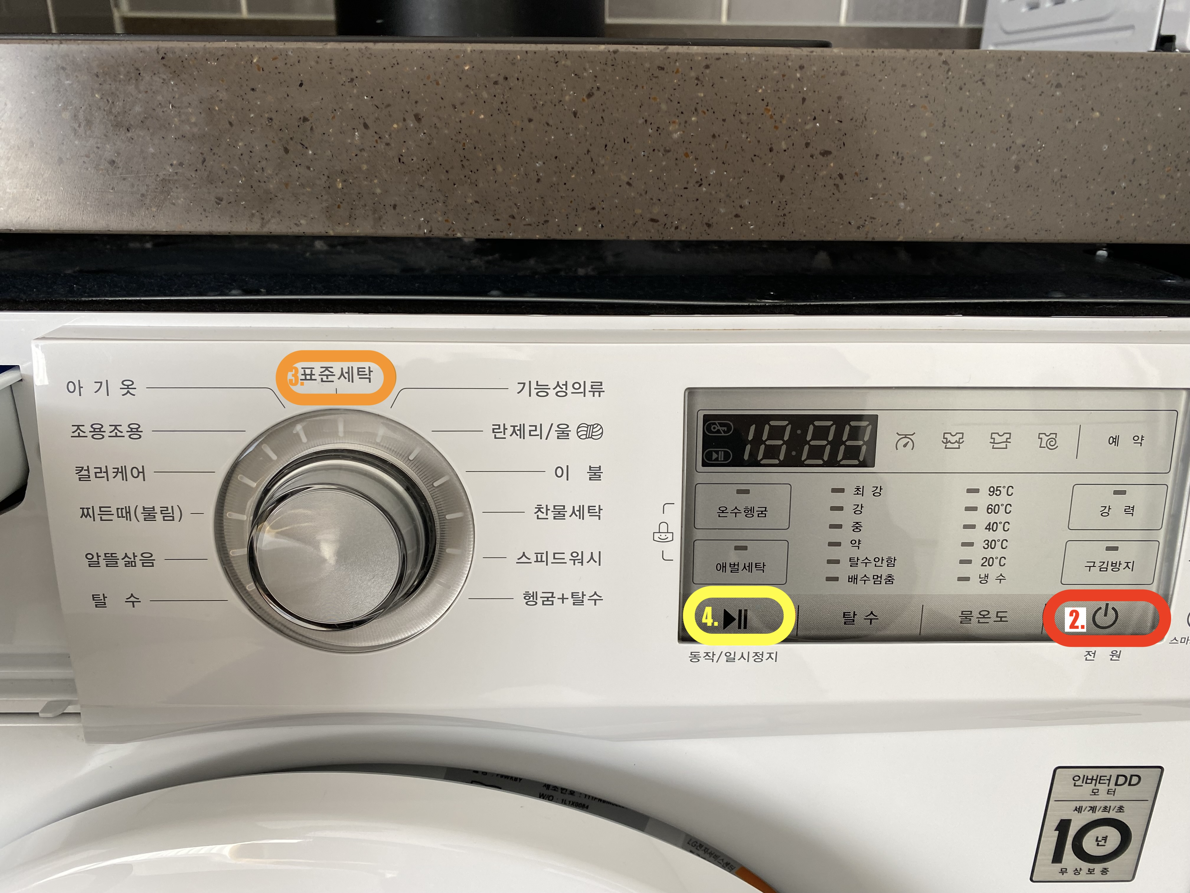 洗剤投入と洗濯モード設定完了後、扉を閉めて黄色の動作/一時停止を押してください。