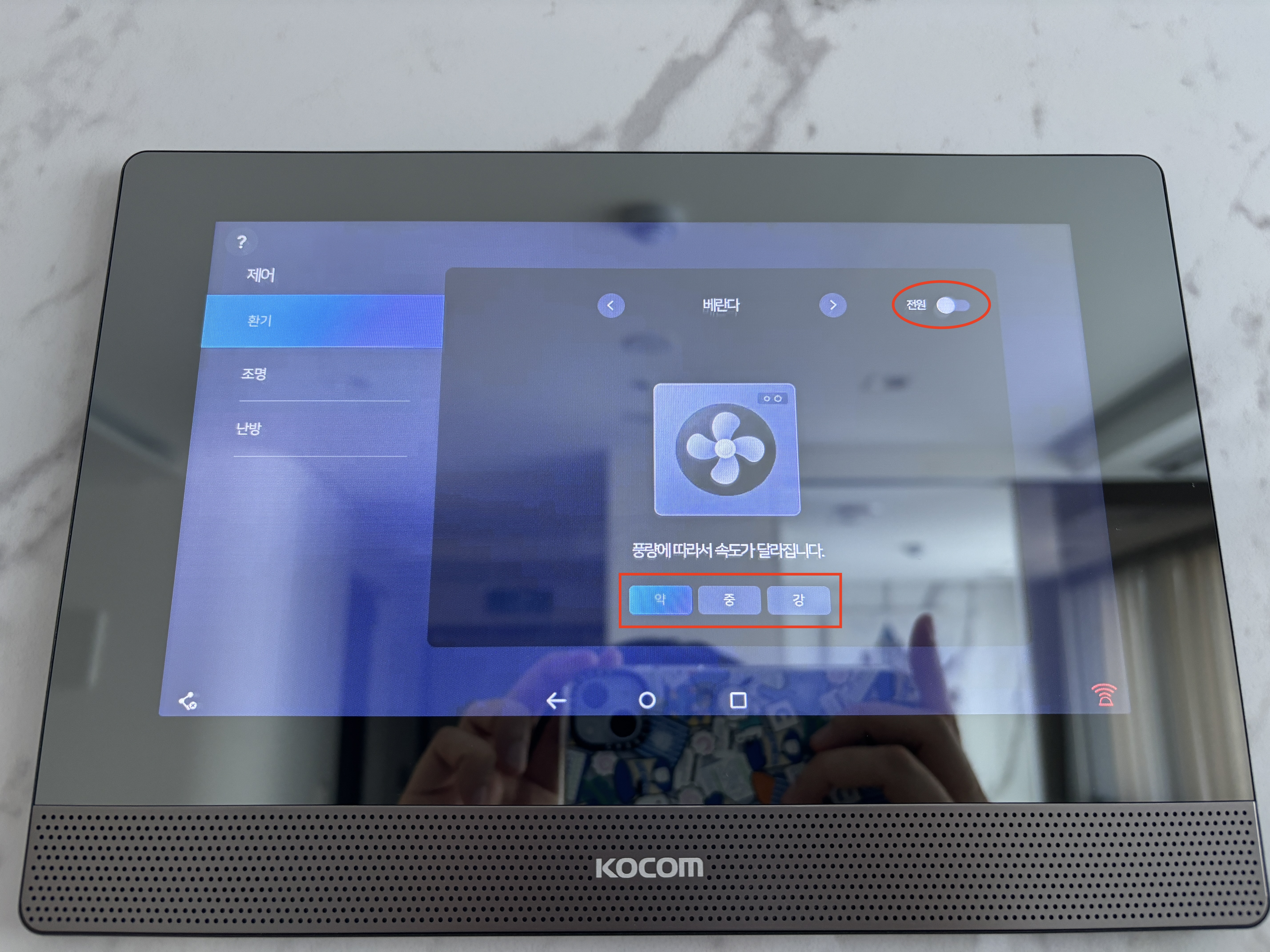 : '전원' 버튼 클릭으로 작동 및 약, 중, 강 버튼 통하여 풍속 조절 가능