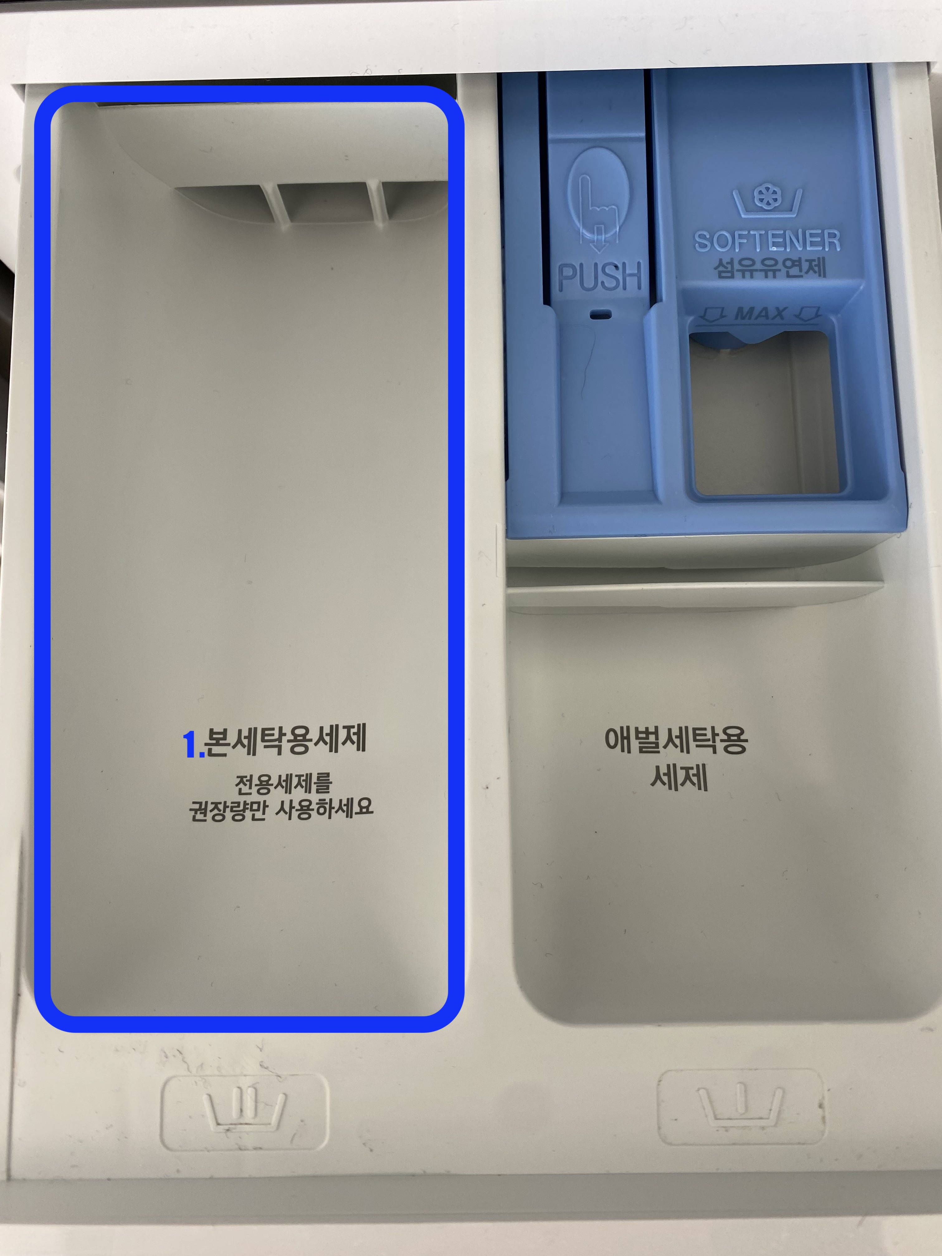 파란색 본세탁용 세제 안에 인덕션 옆 세탁세제(laundry detergent)를 적당량 넣어주세요.