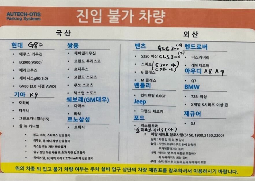 아래 제한되는 차종 확인. (동급차량 및 이상등급의 경우 주차이용 불가)