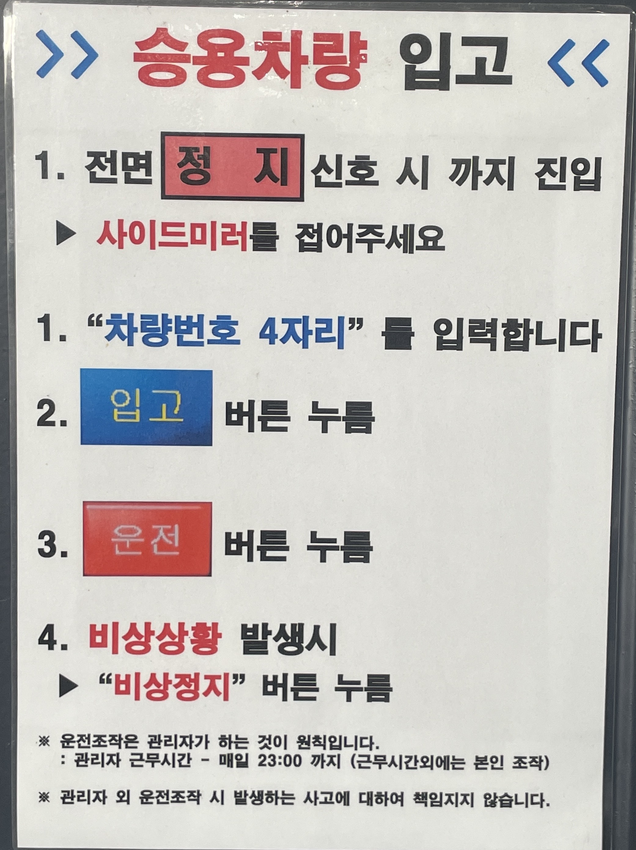 주차타워 입고 방법 (주차타워 입구 왼쪽편에서 해당 설명 확인 가능)