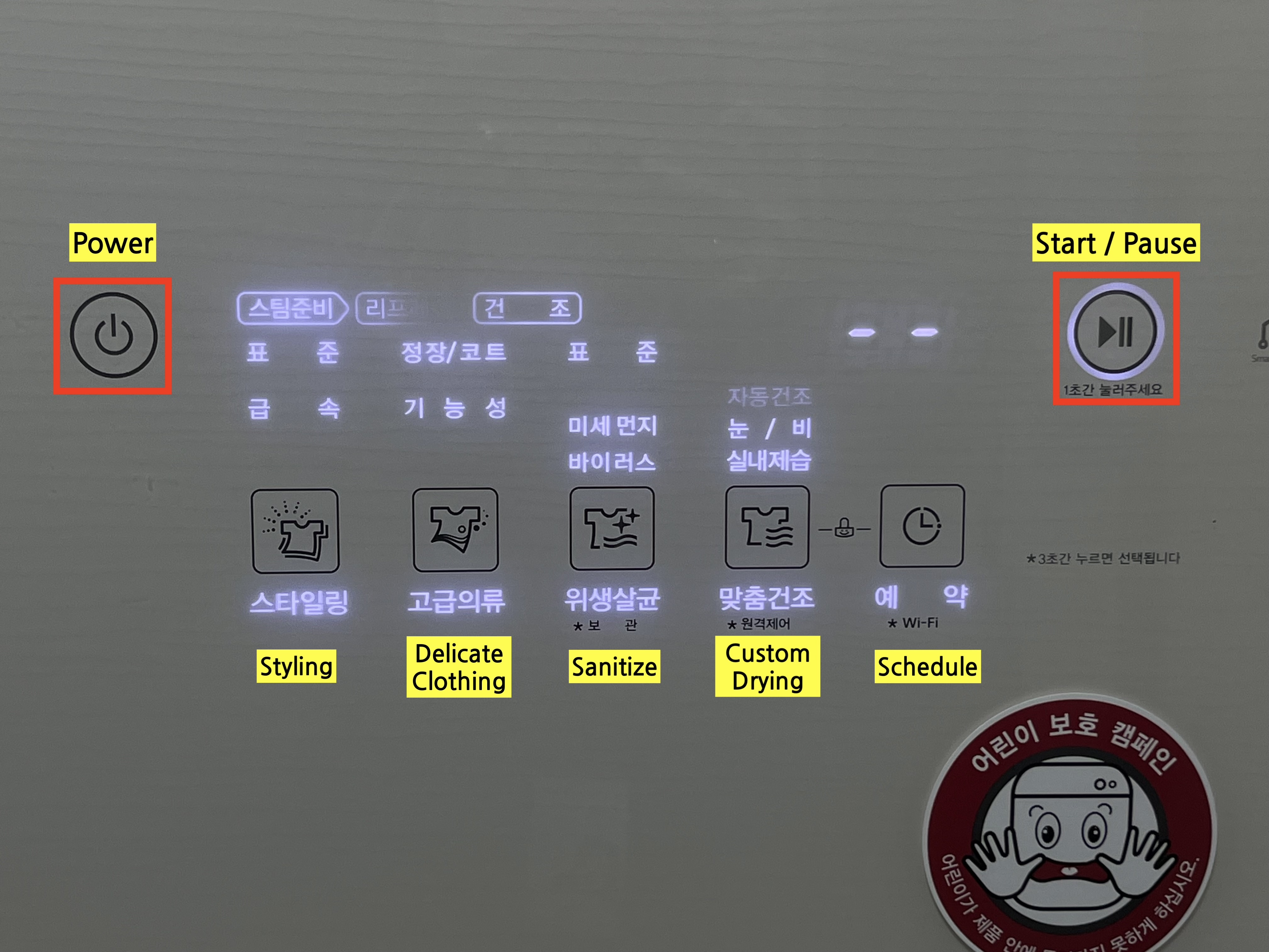 사용 방법 : 전원 on > 희망하는 세탁 방법 선택 > 세제 투입 > 문을 닫고 동작버튼(⏯️)