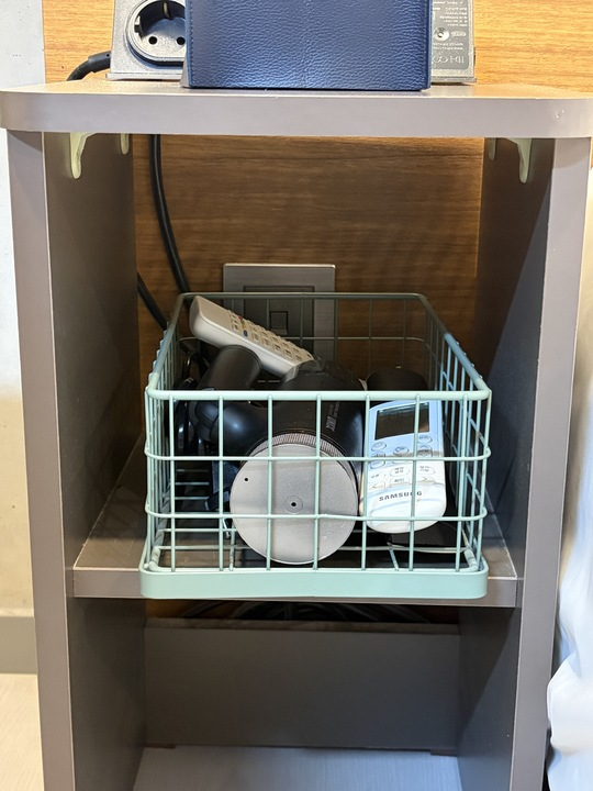 침대 옆 탁자 밑 리모컨이 담겨있는 바구니에 헤어드라이어가 준비되어 있습니다.