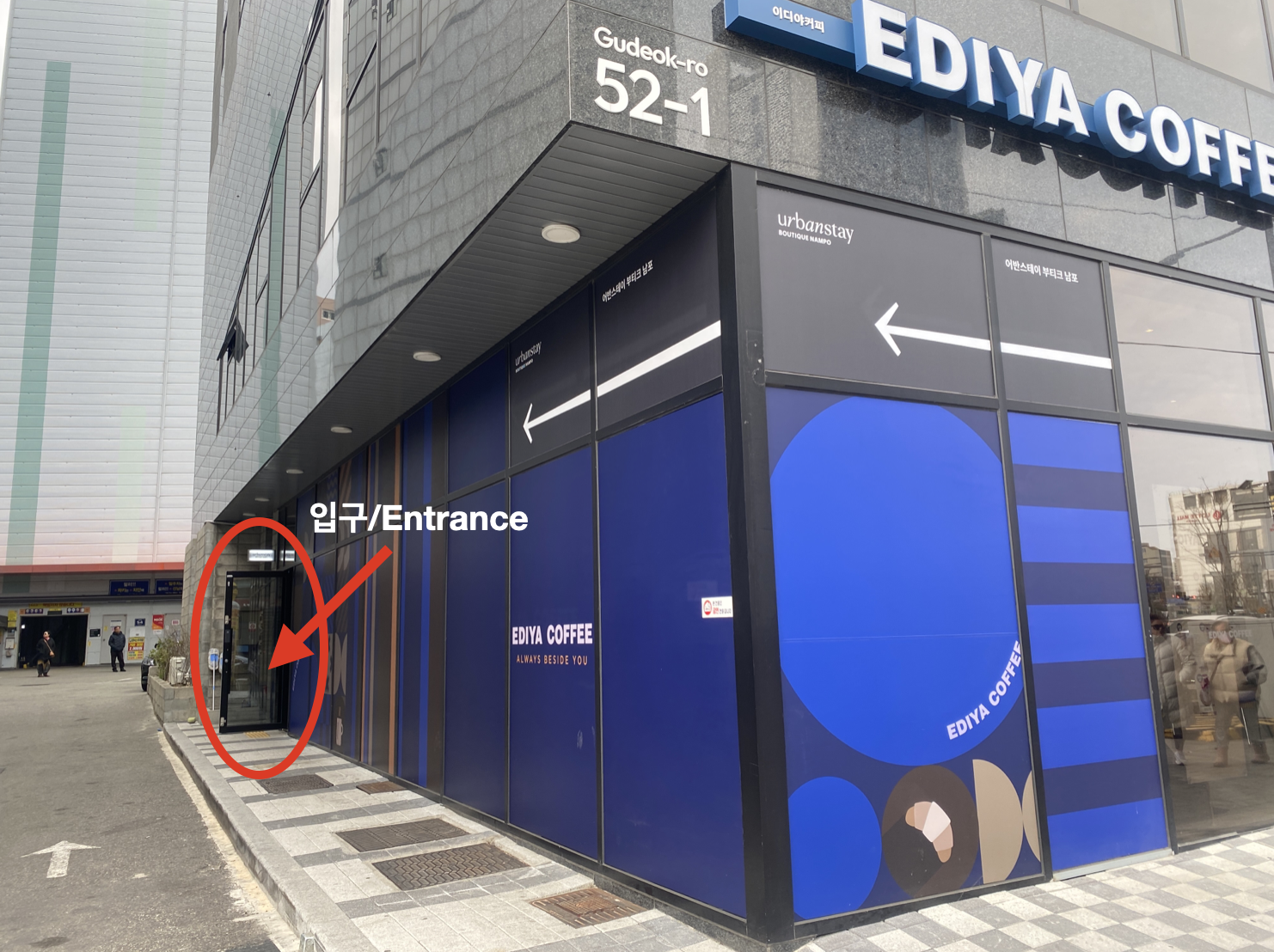 A. 네 맞습니다. 1층엔 이디야 커피가 입점해 있으며, 피닉스 주차장 방면 골목으로 들어오시다 우측에 숙소 입구가 있습니다.