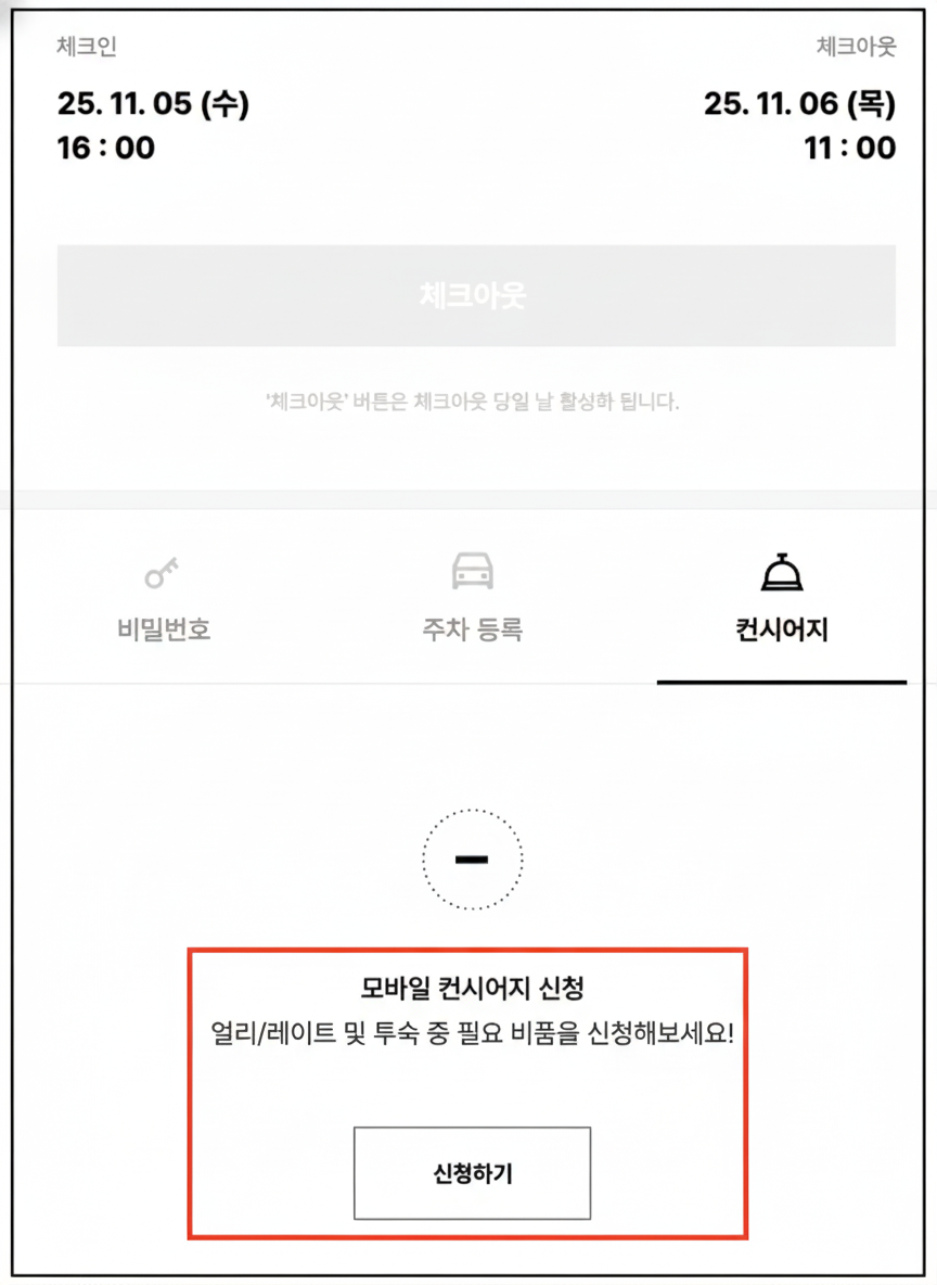 체크인 안내 문자 내의 모바일 컨시어지를 통해 직접 신청 및 결제하실 수 있습니다.
