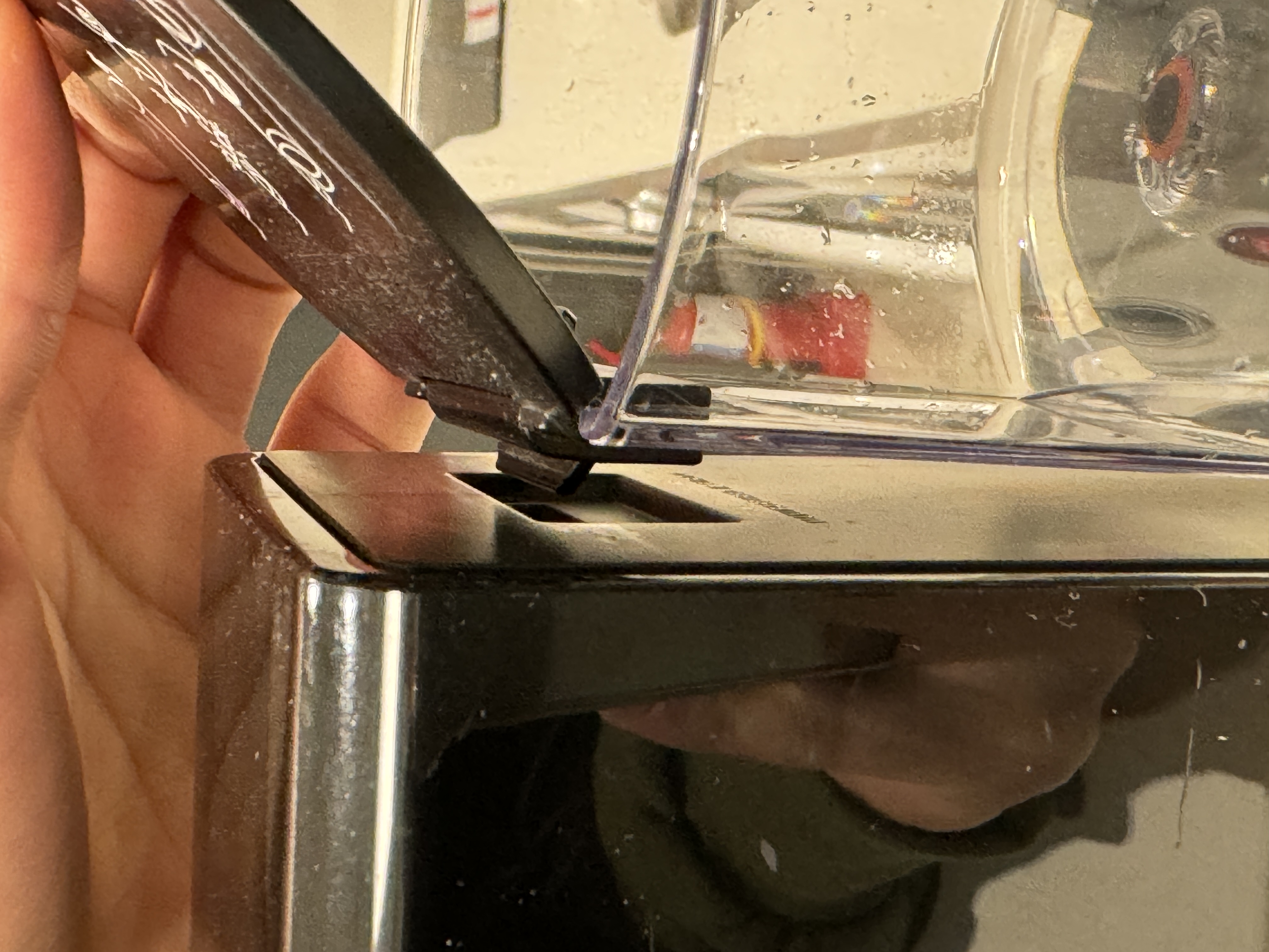 물통의 뚜껑을 연 상태에서 머신 뒷면의 홈에 끼워 결합시킵니다.
