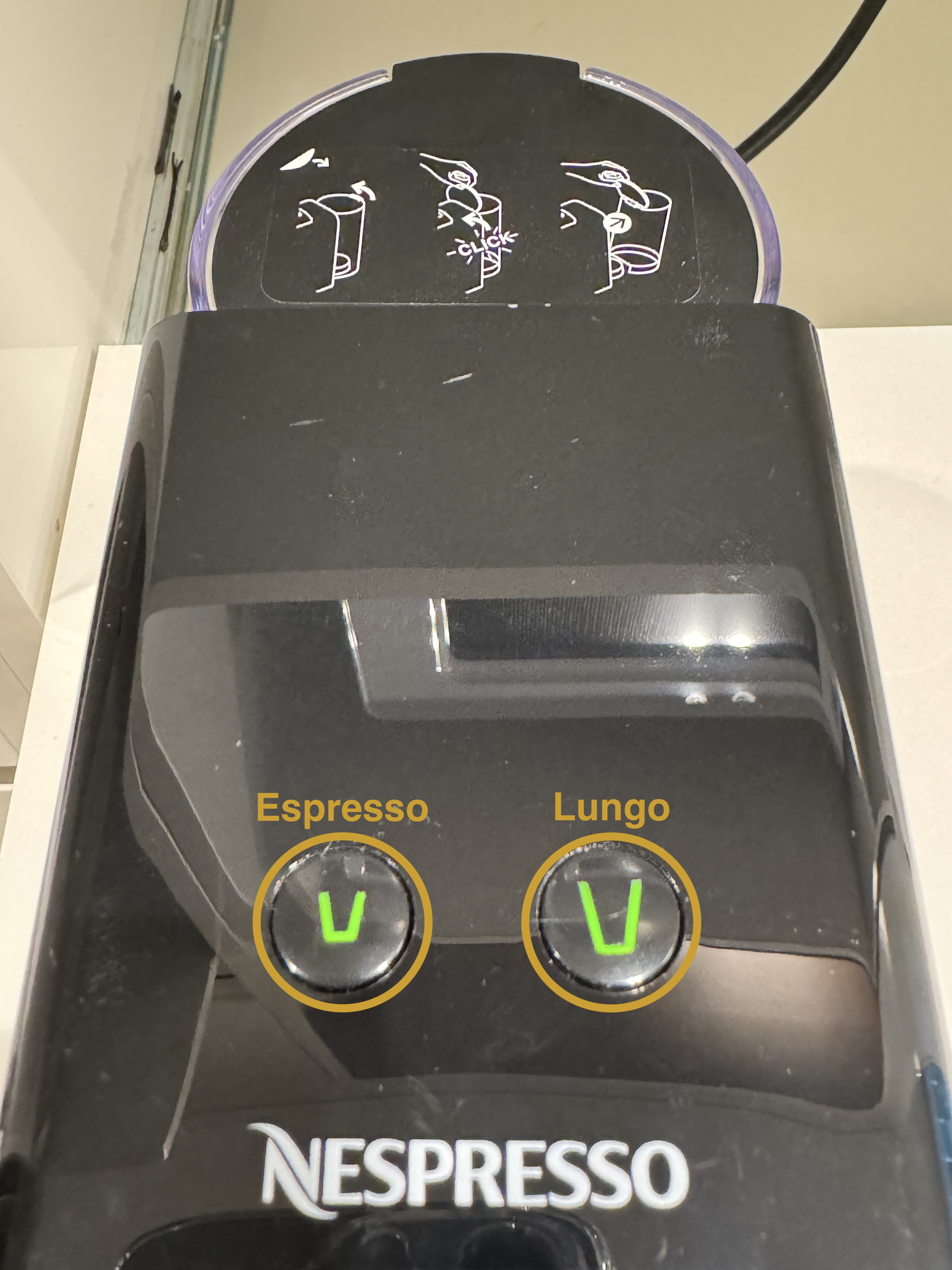 상단 버튼을 누르고 예열이 시작되며 깜빡임이 멈추었을 때 한번 더 원하는 유형의 버튼을 누르면 커피가 추출됩니다.