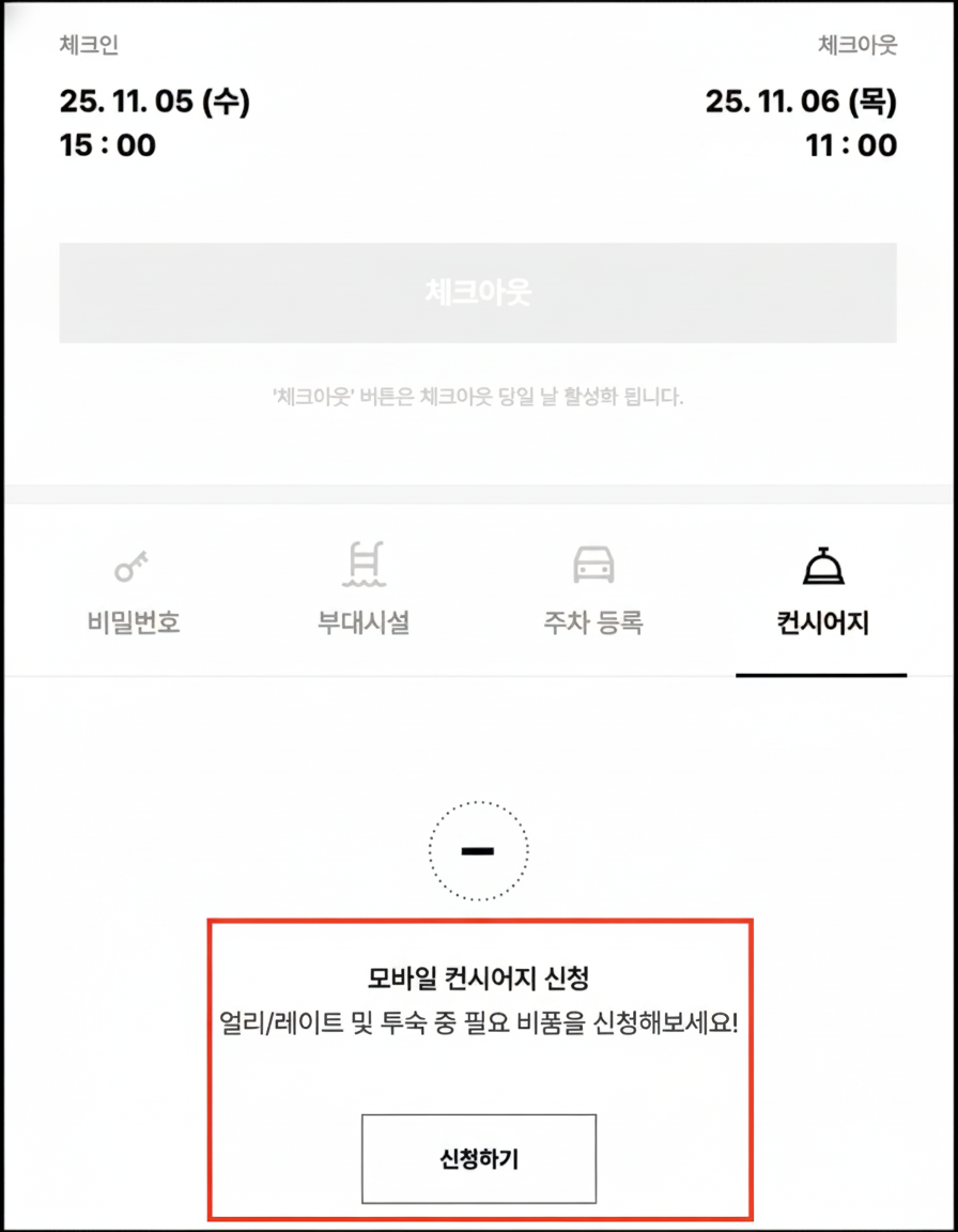 체크인 안내 문자 내의 모바일 컨시어지를 통해 직접 신청 및 결제 하실 수 있습니다.