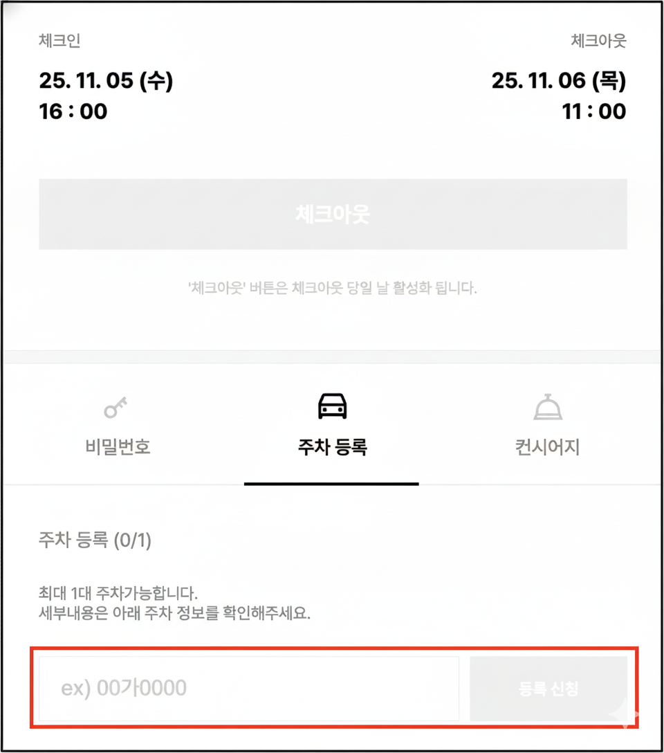 체크인 당일 발송되는 안내 메시지 내의 링크를 통해 '주차 등록' 카테고리에서 직접 등록하실 수 있습니다.