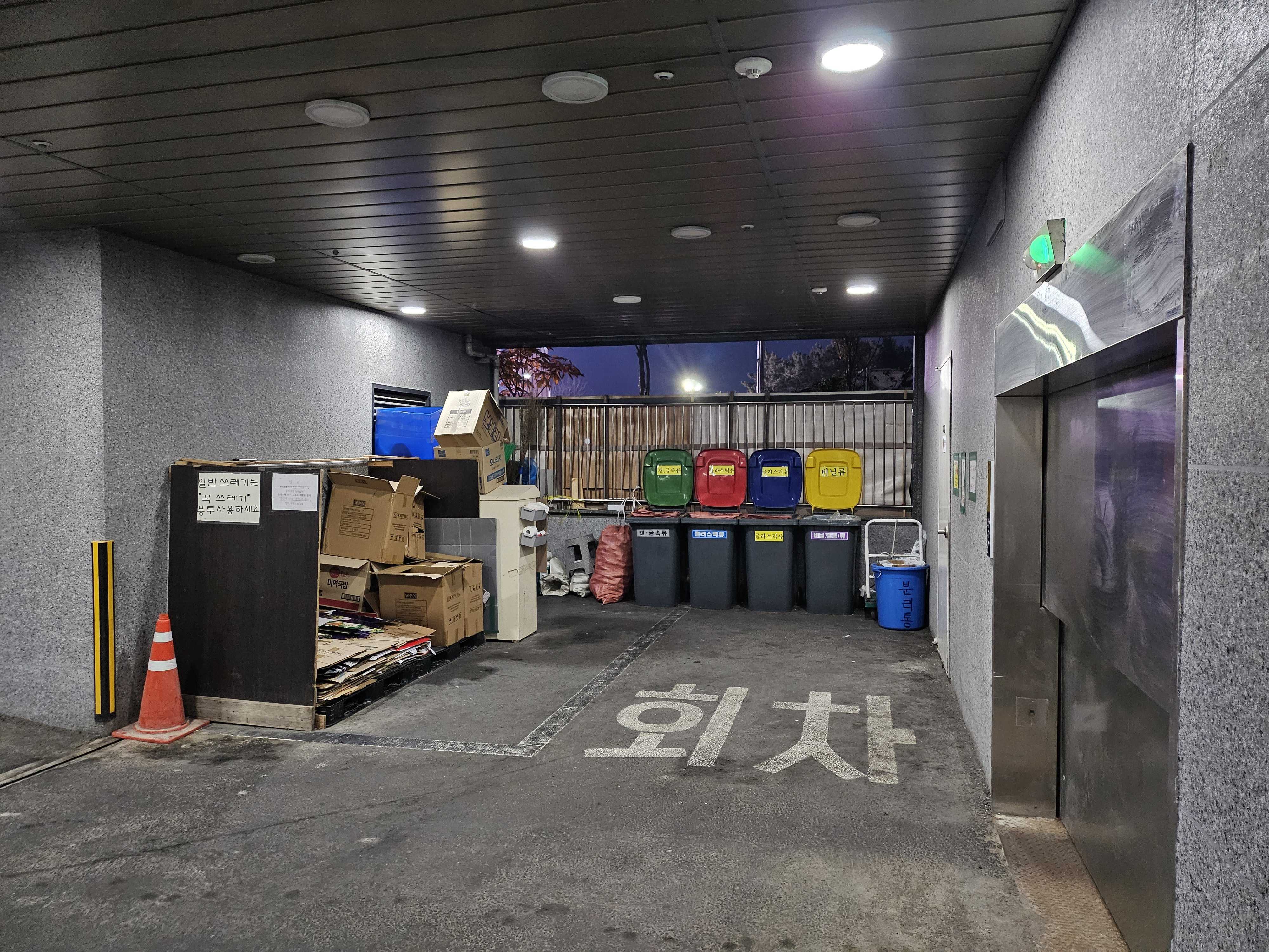 위치 : 종량제 봉투를 직접 구입하여 1층 경비실 뒤편에 위치한 분리수거장을 이용해 주세요. (음식물 쓰레기 배출 불가)