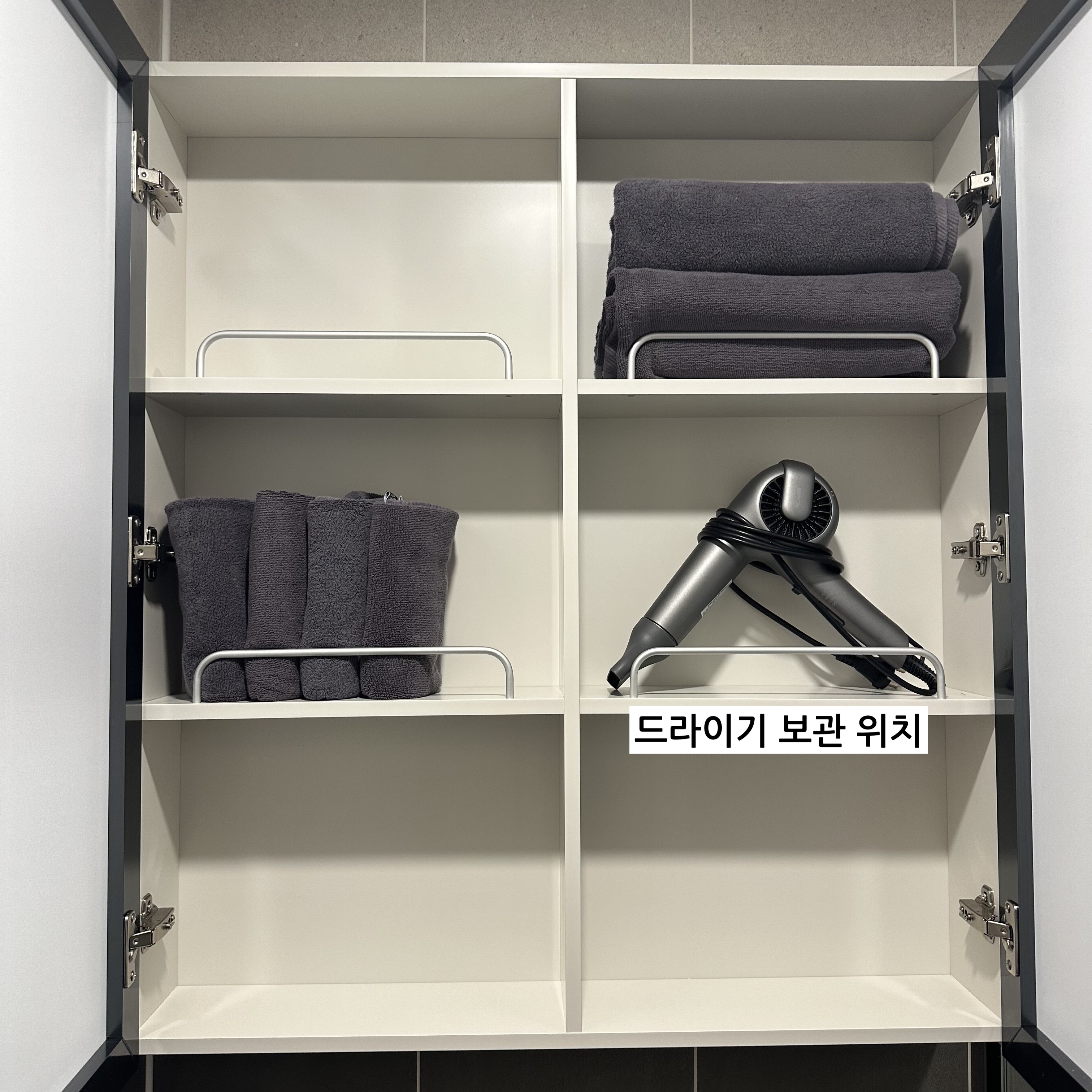 A. 드라이어는 욕실 거울 수납장 안에 비치되어 있습니다.