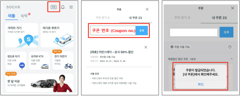 -위치 : 지하 1층 -사용법 : 쏘카 앱 "내 쿠폰" 메뉴-> 할인쿠폰번호 입력