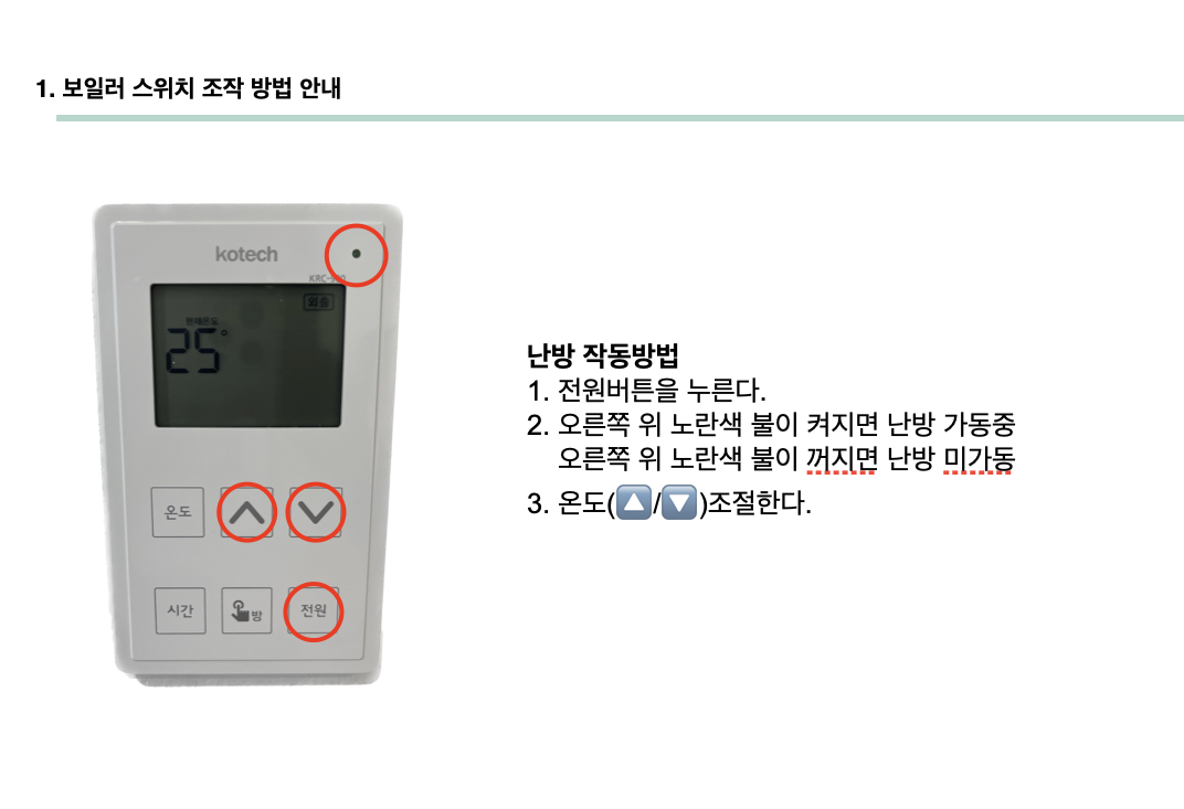 작동방법 : 객실 월패드의 전원버튼을 누른후, 위 아래 버튼으로 온도를 조절하시면 됩니다. 만약 온도를 빠르게 낮추고 싶은 경우, 에어컨 / 환기를 이용하세요.