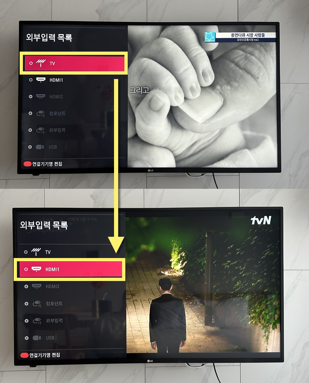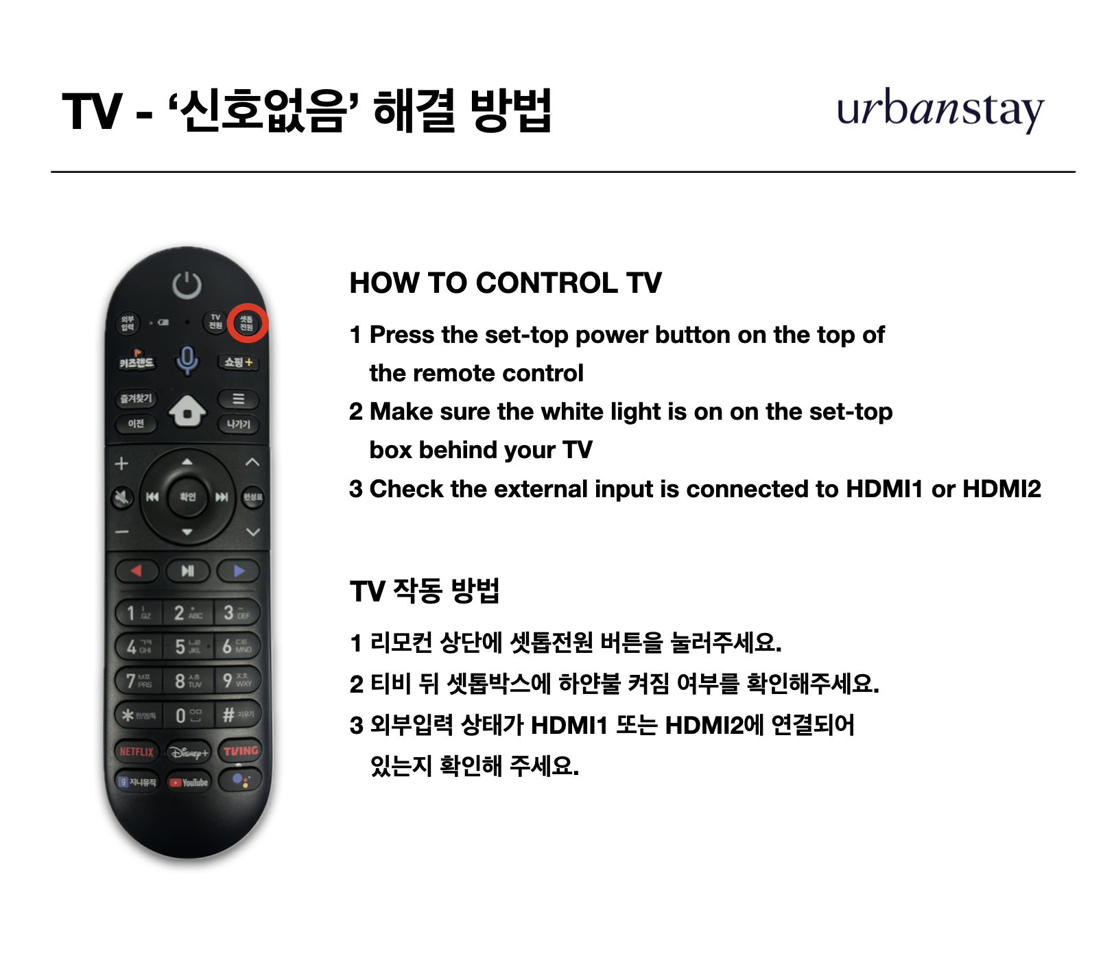 3번 조치로도 해결되지 않는 경우, TV 뒤쪽 셋톱박스의 전원을 확인한 후 다시 연결해 주세요. (최대 5분 소요)