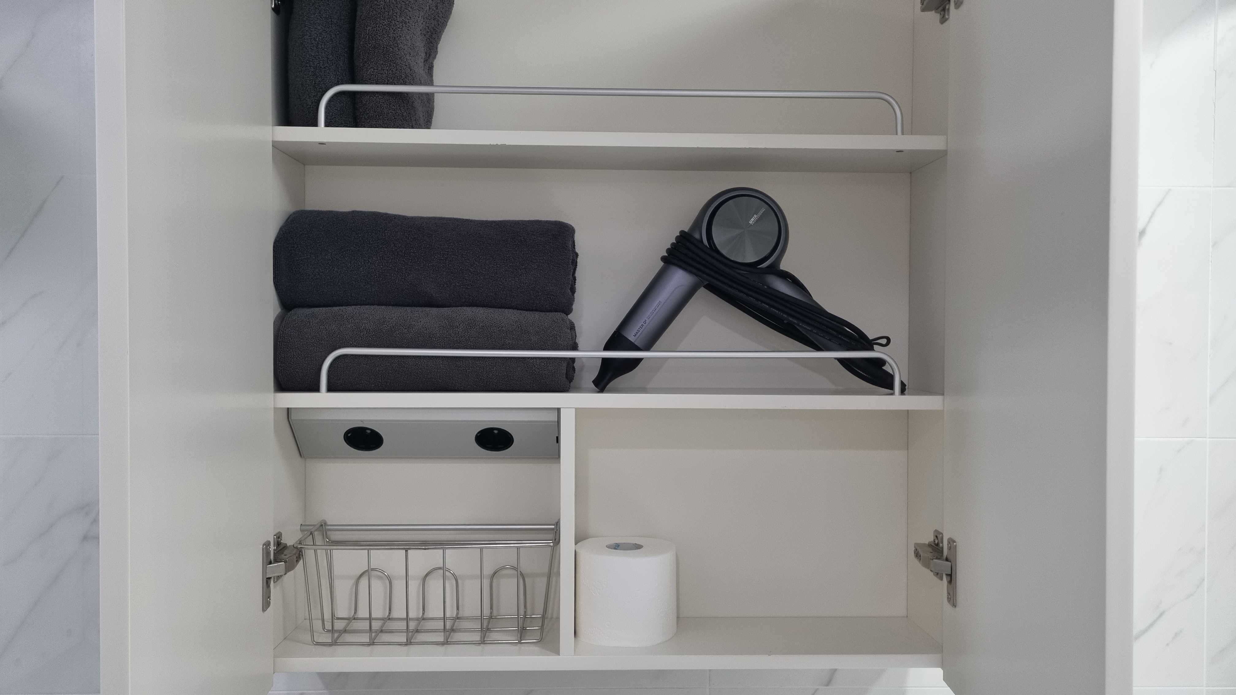 욕실 수납장 안에 헤어 드라이어가 준비되어있습니다.