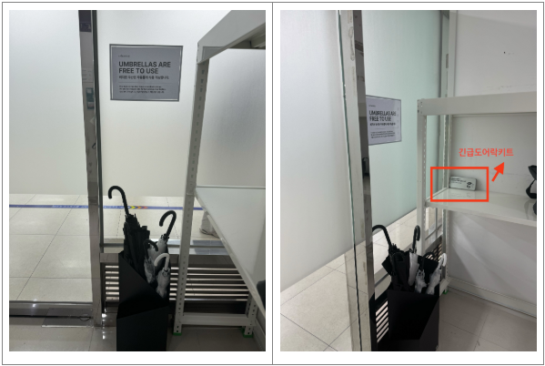 '우산대여' 무료 서비스 운영. 사용 후 제자리에 반납 부탁드립니다.