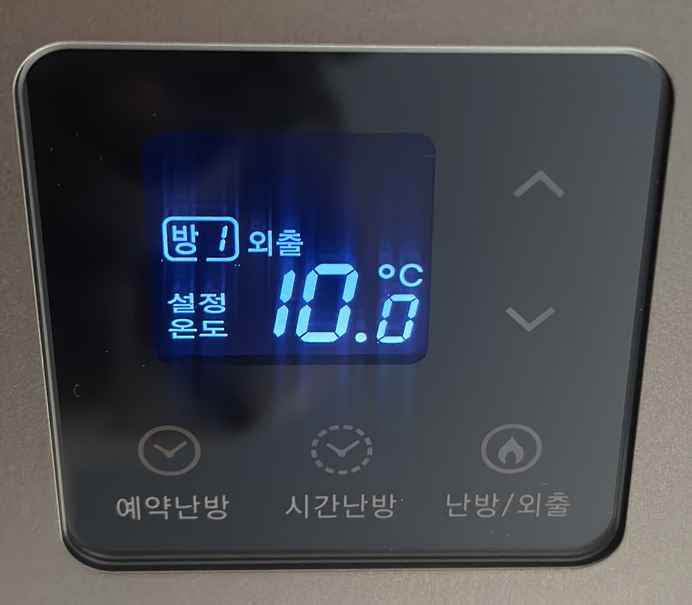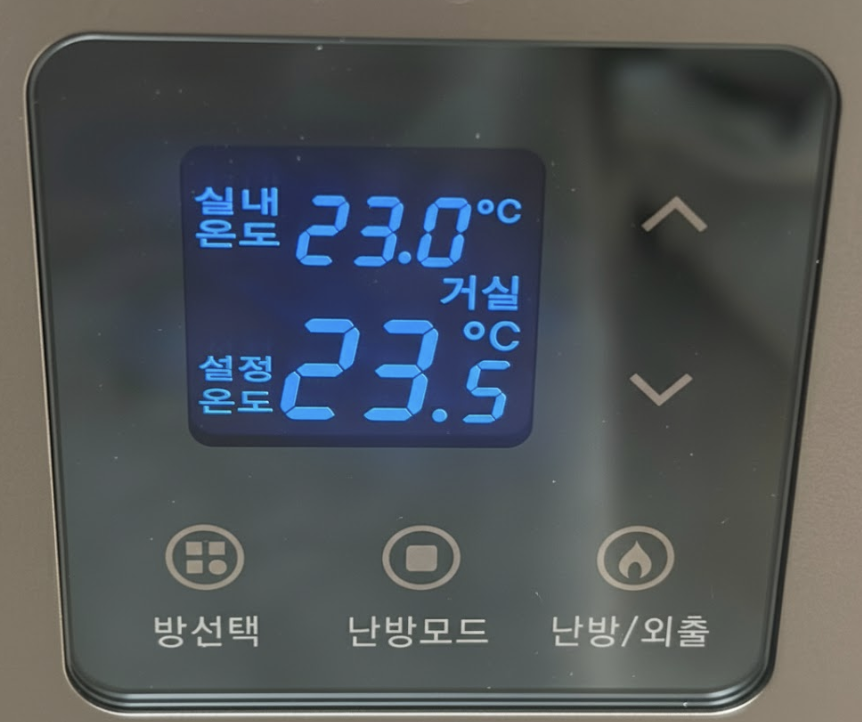 난방을 끄고 싶은 경우, 난방/외출을 버튼을 눌러 [외출모드] 로 전환합니다.