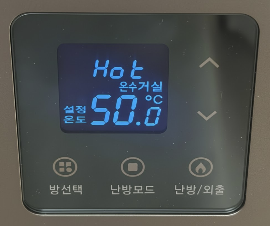만약 보일러가 꺼져 있는 상태라면, 난방/외출 버튼을 눌러 '외출모드'로 전환하여 주십시오.