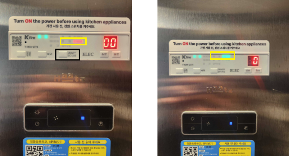 원룸형 객실은 환풍기 후드 하단에 K-FIRE 전원 차단기가 있으며 '전기 닫힘' 이 붉은색으로 나타나는지 확인해주세요. ON/OFF로 차단 스위치를 꾹 눌러 '전기 열림'이 녹색으로 바뀌어야 합니다.