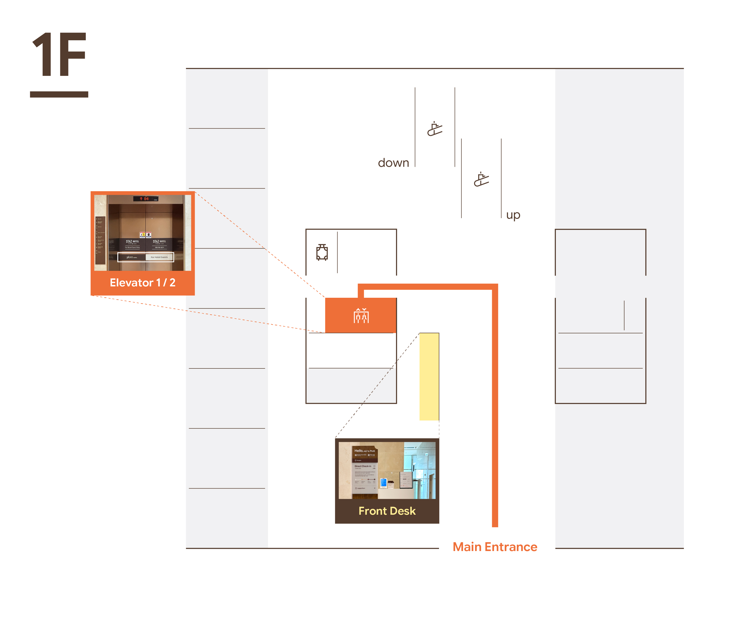 A1. 플라트 전용 엘리베이터를 이용해주셔야 숙소 층 버튼을 누르실 수 있습니다.