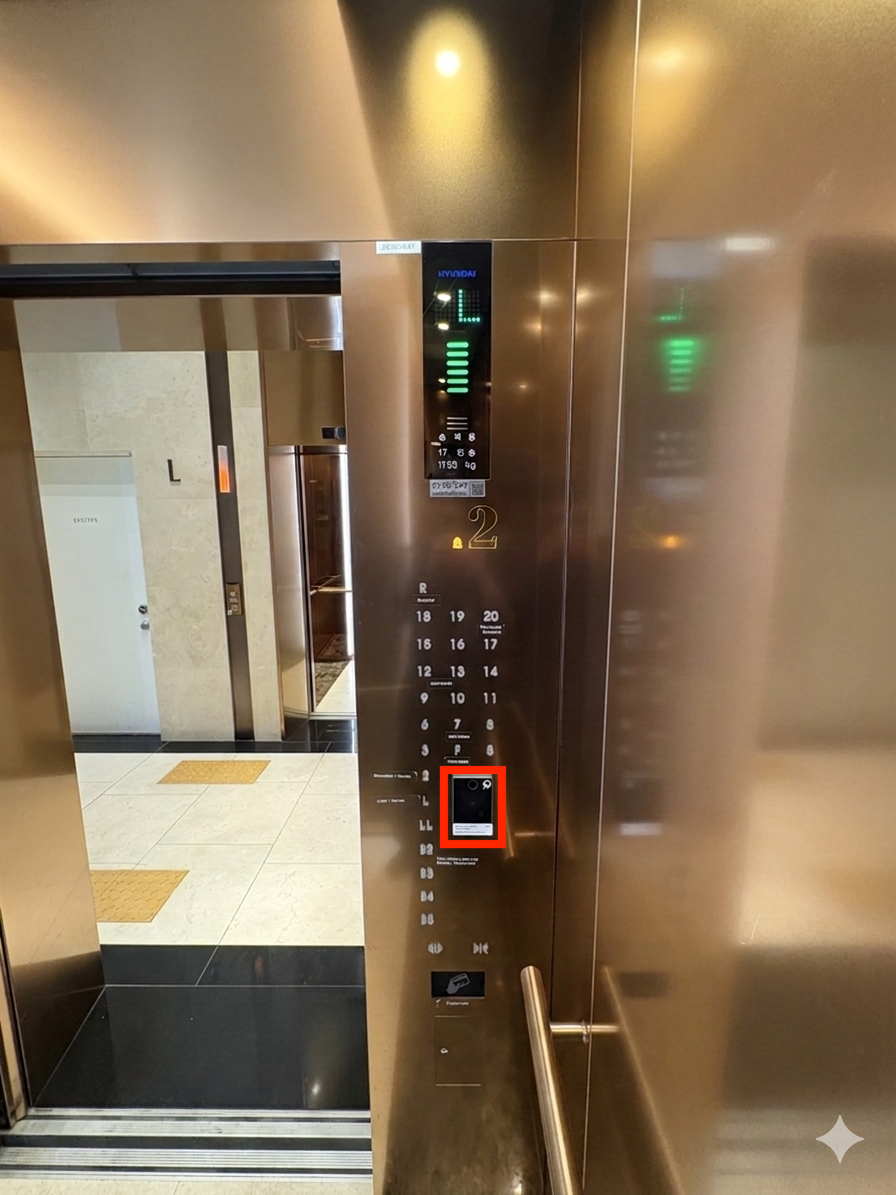 A2. 전용 엘리베이터 하단 검정색 키패드가 있습니다. 터치 후 엘리베이터 비밀번호를 입력해주시면 됩니다.