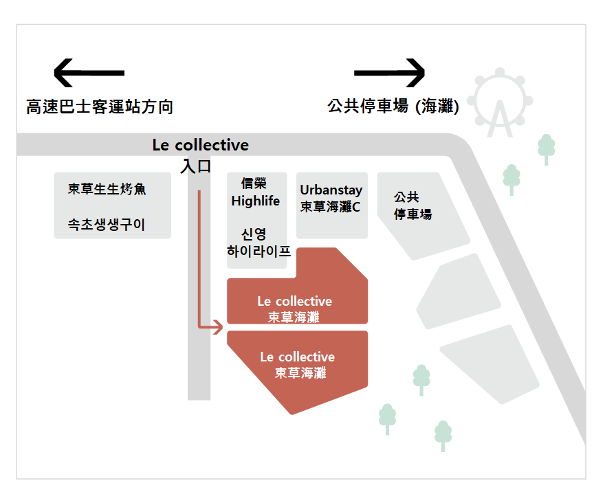 可於Naver地圖、T Map或Kakao導航中搜尋「Le Collective Sokcho Beach」進行導航