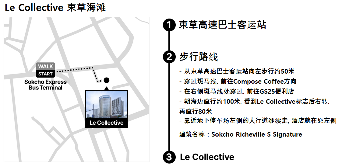 ① 從束草高速巴士客運站出來後向左步行約50公尺② 穿越斑馬線,往Compose Coffee方向前進③ 於右側再次穿越斑馬線,往GS25方向前進④ 沿著海邊方向直走100公尺,於Le Collective標誌處右轉,再往前走80公尺⑤ 走到地下停車場旁邊的左側人行道,飯店就在您的左側 (建築名稱:Sokcho Richeville S Signature) |