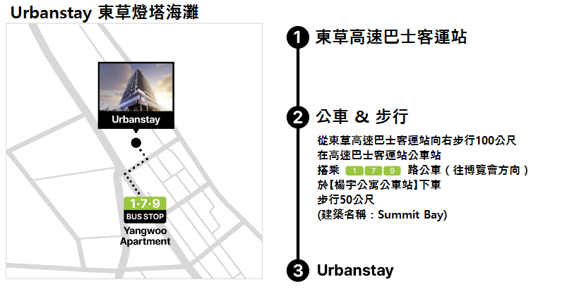 ① 從束草高速巴士客運站向右步行100公尺 ② 抵達「高速巴士客運站」公車站 ③ 搭乘1路、7路或9路公車(往 EXPO 方向) ④ 於「Yangwoo Apartment(양우아파트)」公車站下車 ⑤ 步行50公尺(建築名稱:Summit Bay) |