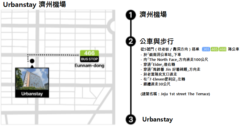 搭乘公車:機場出發 → 往新濟州方向搭乘 365、465、466 號公車,在「銀南洞」站下車後步行3分鐘
