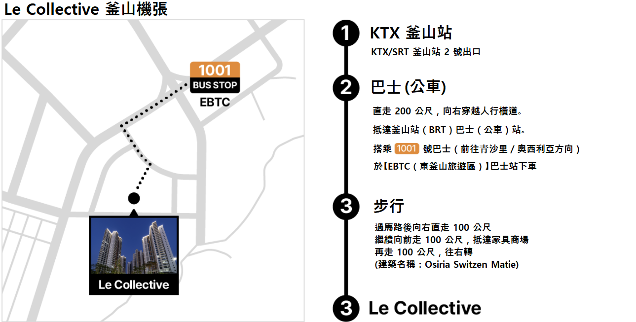 A1. 東釜山觀光園區(鄰近 Osiria 站的公車站)搭乘公車資訊:185號、139號、1001號釜山站搭乘資訊:搭乘1001號後轉乘100號或181號,或搭乘1003號後轉乘100號或181號