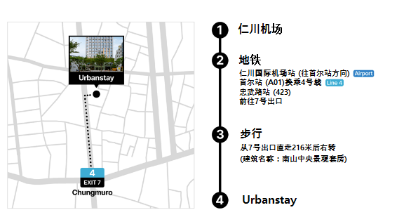 乘坐机场快线到首尔站 > 换乘4号线到忠武路站 > 从7号出口直走约5分钟