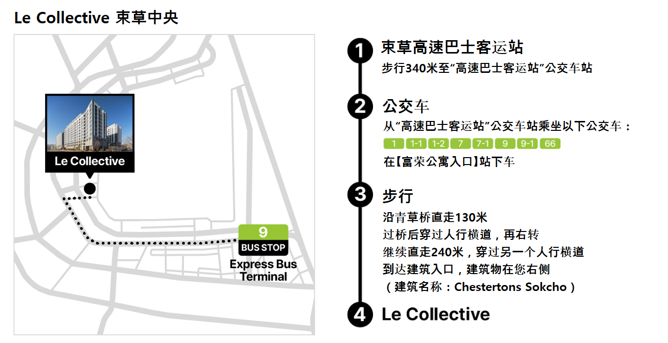 KTX列车:从首尔站 / 清凉里站 / 上凤站 → 江陵站 →从江陵市外巴士客运站换乘 → 束草市外巴士客运站
