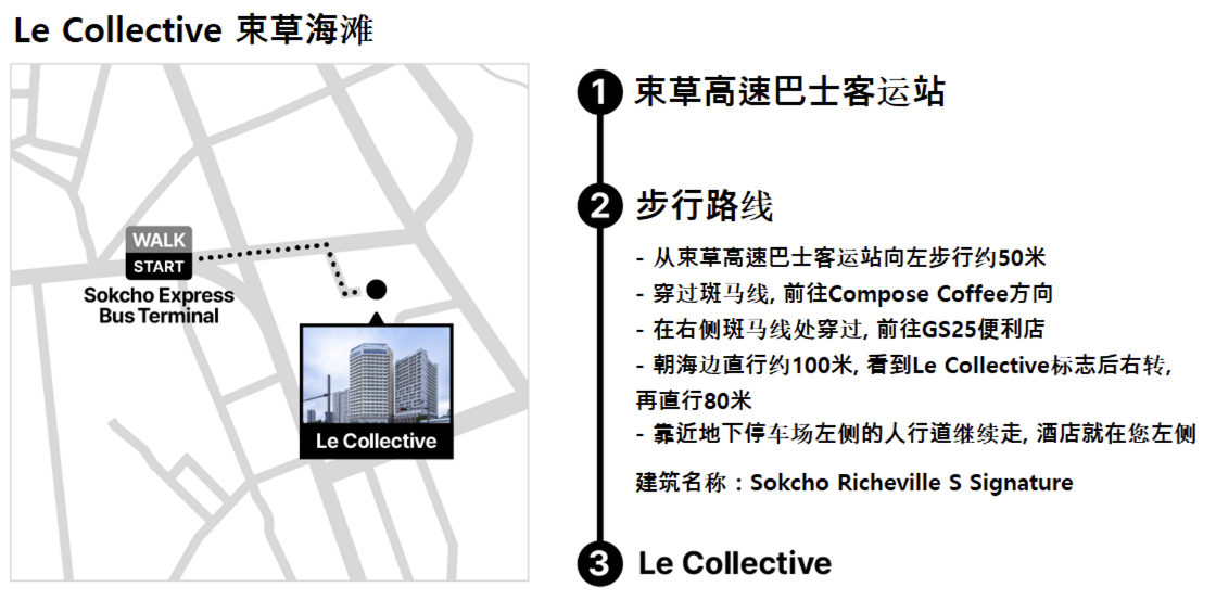 ① 从束草高速巴士客运站出来后向左步行约50米 ② 穿过人行横道,朝Compose Coffee方向前进 ③ 在右侧再次穿过人行横道,朝GS25方向前进 ④ 沿着海边方向直行100米,在Le Collective标志处右转,再前行80米 ⑤ 走到地下停车场旁边的左侧人行道,酒店就在您的左侧(建筑名称:Sokcho Richeville S Signature) |