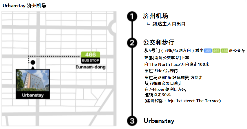 位置信息地址:济州特别自治道 济州市 莲洞6街 5建筑名称:济州1号街露台 (제주 1번가 테라스)路线查询:Naver 地图路线查询:Google 地图请在 Naver地图、T map、Kakao导航中搜索“Urbanstay 济州机场”。建筑1楼设有 7-Eleven 便利店。交通方式乘坐公交:从机场出发 → 往新济州方向搭乘 365、465、466 路公交,在“银南洞”站下车后步行3分钟乘坐出租车 / 自驾:从机场出发约10分钟Q&AQ1. 可以帮我叫出租车吗?A1. 本住宿不提供叫车服务。但本区域为繁华地段,通常打车不会有困难。