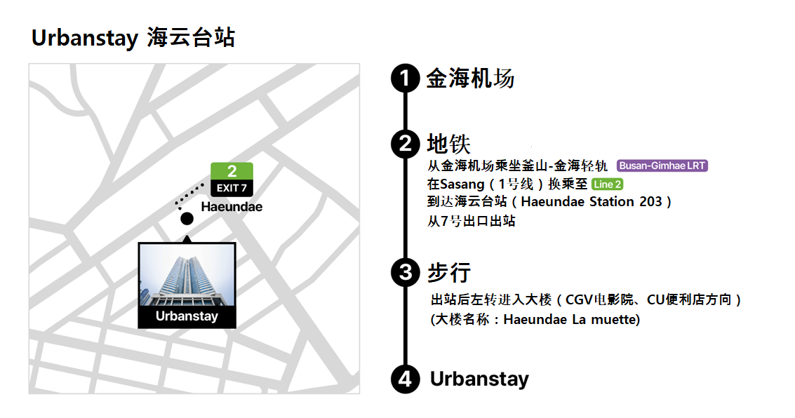 A1. 本住宿邻近釜山地铁2号线海云台站。特别是从7号出口方向前往时,可通过设有自动扶梯的人行通道直达建筑内。