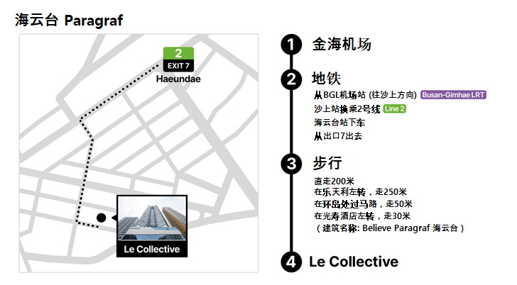 搭乘金海轻轨(往沙上方向)→ 沙上站转乘地铁2号线 → 海云台站下车(7号出口)→ 步行约8分钟