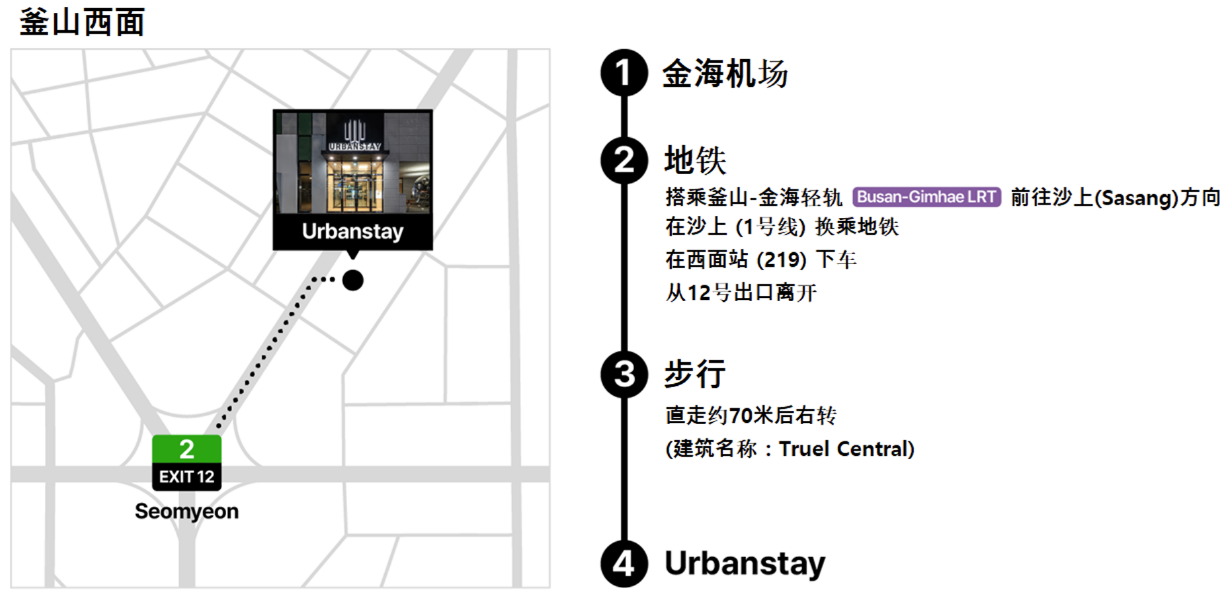 地铁:从西面站(Seomyeon)12号出口直行约70公尺即达(位于新韩银行旁)