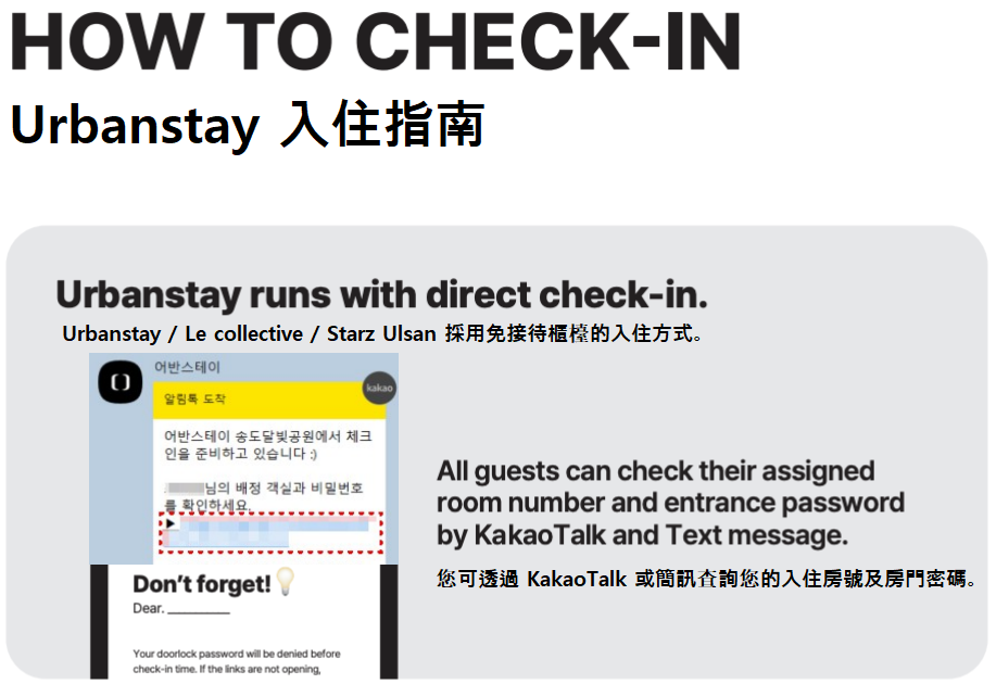 ※ 入住当天上午 11:00,Urbanstay 将通过 KakaoTalk、短信、Email(外国人)发送您的房号及门锁密码。
